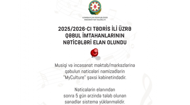 Musiqi, incəsənət məktəb və mərkəzlərinə 2025/2026-cı tədris ili üzrə qəbul imtahanlarının nəticələri açıqlanıb