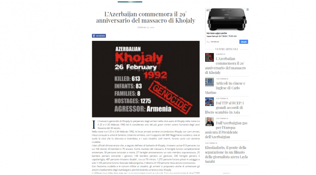 İtaliya mediası: "Azərbaycanda Xocalı qətliamının 29-cu ildönümü qeyd edilir"