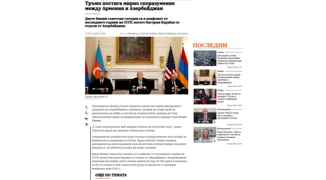 Bolqarıstan mətbuatı: Vaşinqtondakı tarixi sülh sazişi Cənubi Qafqazda yeni mərhələnin əsasını qoyur