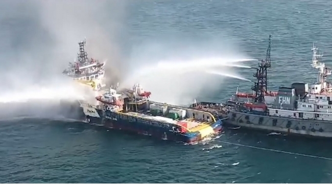 Xəzərdə təchizat gəmisindəki yanğının söndürülməsi əməliyyatı fasiləsiz davam etdirilir-