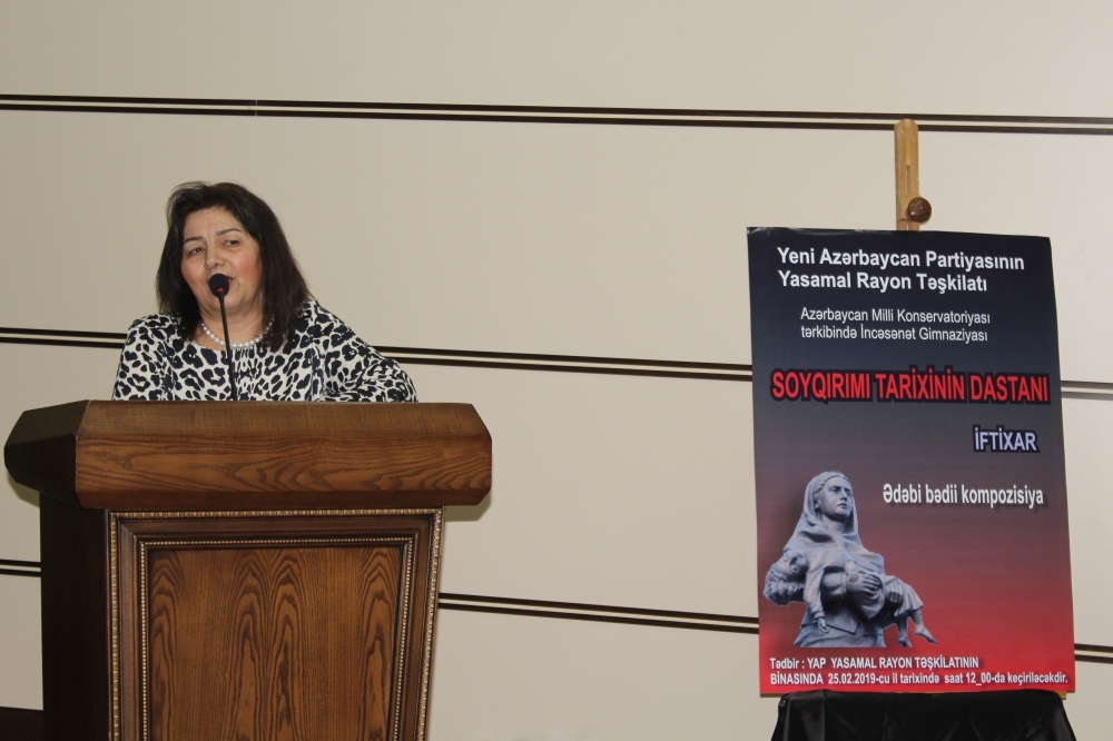 YAP Yasamal rayon təşkilatının sədri Tağı Əhmədov çıxış edərək sovetlərin 366-cı alayının, həmin hərbi hissədə toplanan erməni zabitlərinin və xarici ölkələrdən gətirilmiş muzdluların iştirakı ilə Xocalıda törədilən qətliamı insanlığa, bütünlükdə bəşəriyyətə qarşı cinayət adlandırdı: