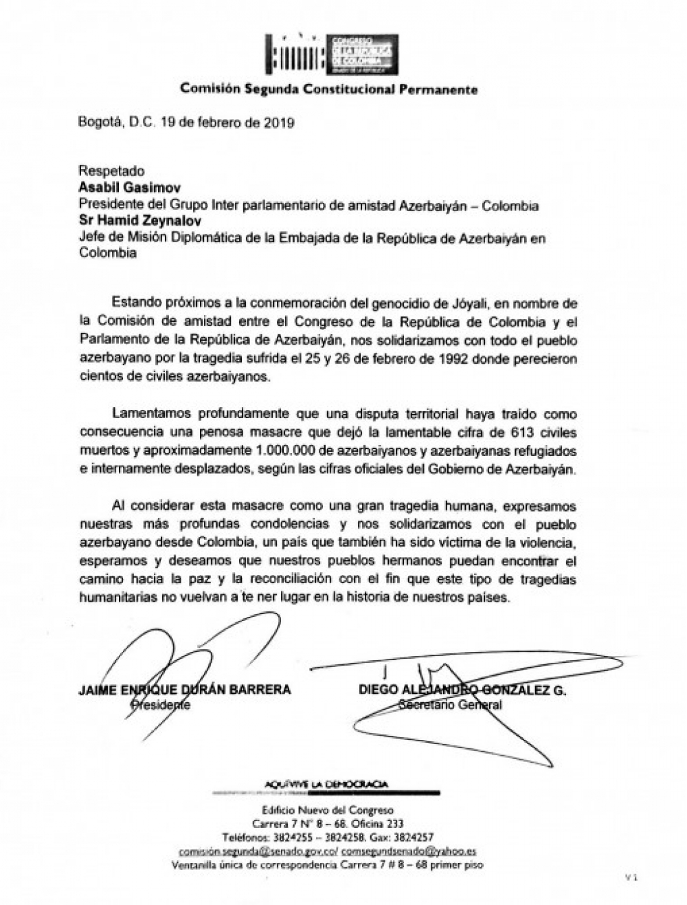 Xocalı soyqırımı ilə əlaqədar Kolumbiya parlamentinin beynəlxalq əlaqələr komitəsinin sədri Xaime Duran və həmin komitənin baş katibi Dieqo Alexandro Qonzalez tərəfindən ölkəmizin Boqotadakı səfirliyinə başsağlığı məktubu ünvanlanıb.