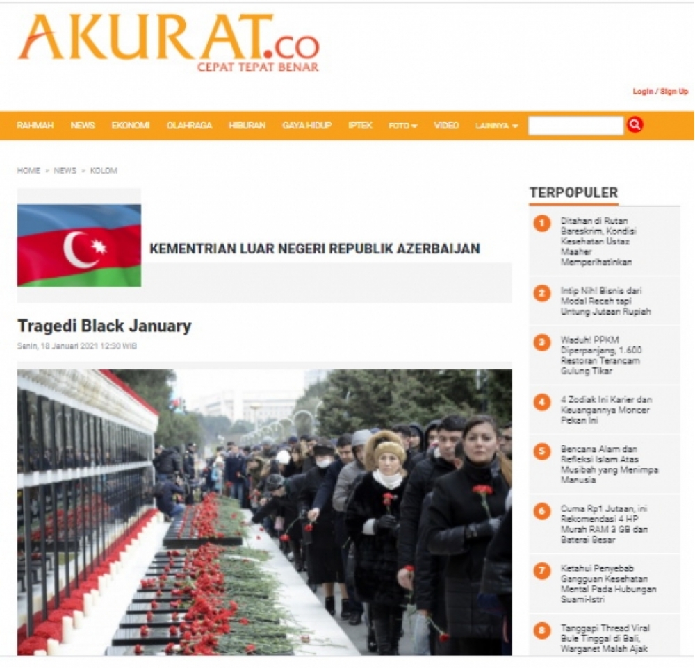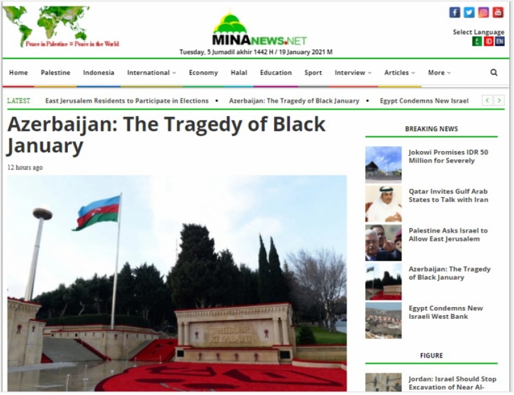 "İki sahil" AZƏRTAC-a istinadən xəbər verir ki, İndoneziyanın “Miraj” Xəbər Agentliyinin internet səhifəsində və “akurat.co.id” xəbər portalında 20 Yanvar faciəsi haqqında “Qara Yanvar faciəsi” və “Azərbaycan: Qara Yanvar faciəsi” sərlövhəli məqalələrdə yerli oxuculara faciənin tarixi barədə ətraflı məlumat verilib.