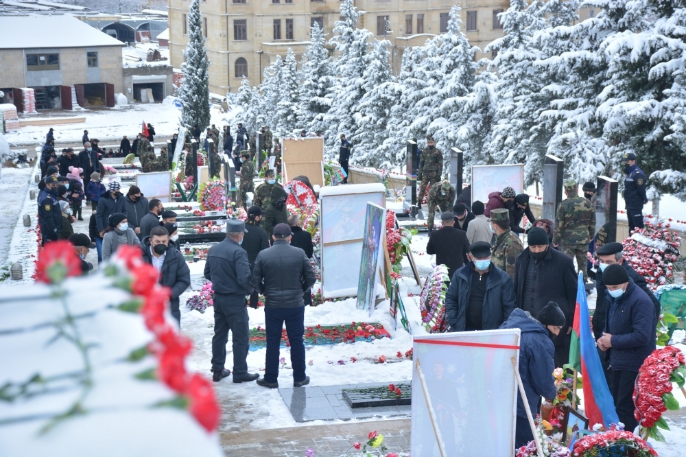 Şəhidlərin ruhuna ucaldılan abidənin önünə əklil qoyulub, məzarları üzərinə tər çiçəklərə düzülüb.