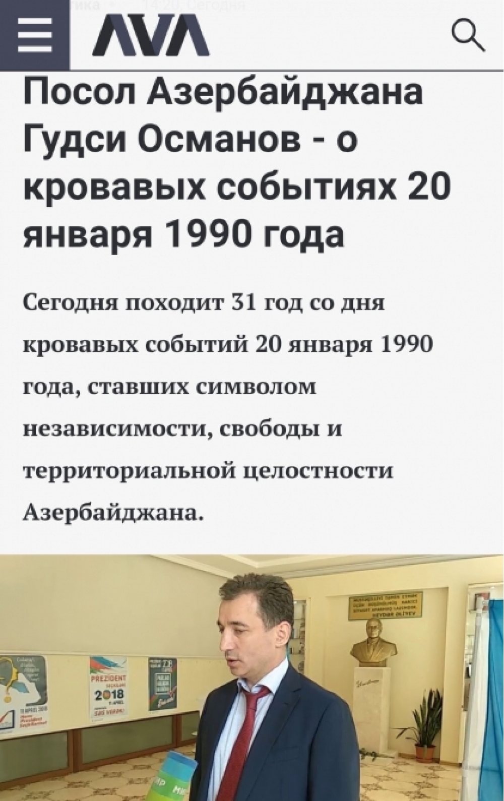 "İki sahil" xəbər verir ki, səfir məqaləsində Azərbaycanın müstəqilliyinin, azadlığının və ərazi bütövlüyünün rəmzi hesab edilən 1990-cı il 20 Yanvar hadisələrindən 31 il keçdiyini bildirir. Qeyd edir ki, 1987-ci ilin sonunda sovet rəhbərliyinin razılığı ilə Ermənistan SSR-in ölkəmizə qarşı ərazi iddiaları yenidən başladı, erməni separatçılığı Dağlıq Qarabağda baş qaldırdı, azərbaycanlılara qarşı kütləvi zorakılıqlar başladı, yüz minlərlə soydaşımız öz doğma torpaqlarından - Ermənistandan və Dağlıq Qarabağdan qovuldu. Bütün bunlar ermənilərin Azərbaycan ərazilərinə ardıcıl köçürülməsinin, xalqımıza qarşı məqsədyönlü şəkildə həyata keçirilən etnik təmizləmənin və soyqırımının davam etdirilməsinin növbəti mərhələsi idi. Azərbaycan xalqı SSRİ rəhbərliyindən Azərbaycanın ərazi bütövlüyünün təmin edilməsini, həyat və təhlükəsizliyin erməni terrorçularından qorunmasını tələb etdi. Davamlı artan gərginliyin qarşısını almaq əvəzinə sovet rəhbərliyi SSRİ və Azərbaycan SSR konstitusiyalarını pozaraq Azərbaycan Ali Sovetinin Rəyasət Heyətinin razılığı olmadan xalqımıza qarşı hərbi qoşunlar göndərdi.