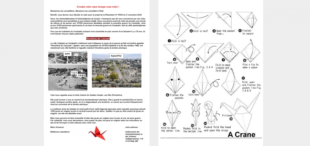 Müraciətin sonunda xirosimalı qız Sadako Sasakinin kədərli hekayəsini xatırladan soydaşlarımız deputatlara sülh və müharibəsiz həyat naminə birlikdə kağızdan durna-oriqami düzəltməyi və öz adlarından İsveçrə Azərbaycanlıları Koordinasiya Şurasının ünvanına göndərməyi xahiş ediblər.