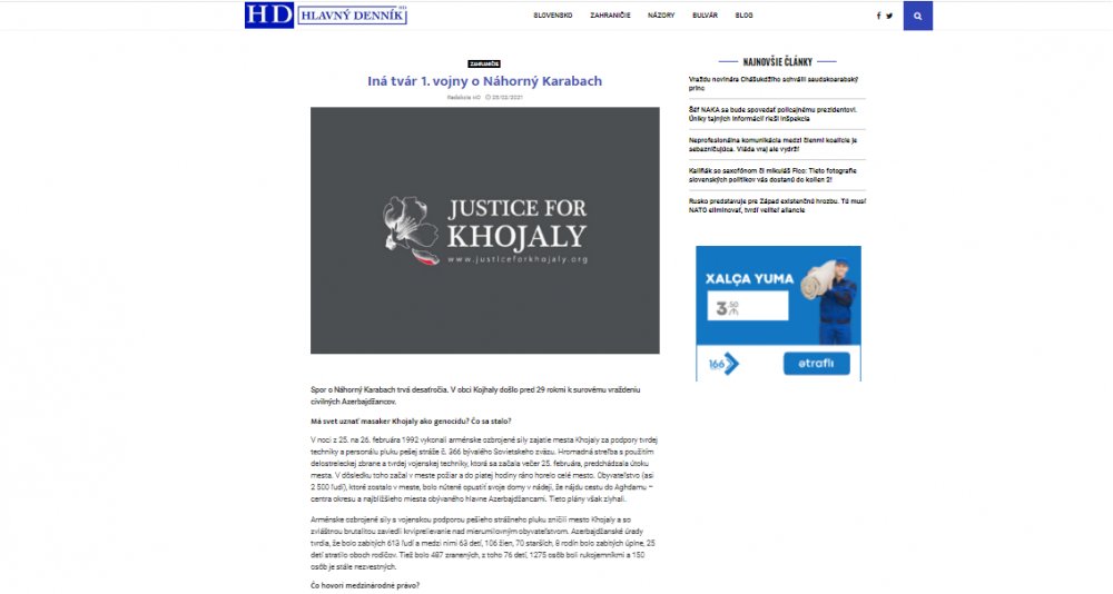 Slovakiya Azərbaycanlıları Assosiasiyasının rəhbəri Rustəm Rustəmovun təşəbbüsü ilə ölkənin nüfuzlu "Hlavny Dennik" xəbər portalında Xocalı soyqırımının 29-cu ildönümünə həsr olunmuş "Birinci Qarabağ müharibəsinin başqa üzü" sərlövhəli məqalə yerləşdirilib.