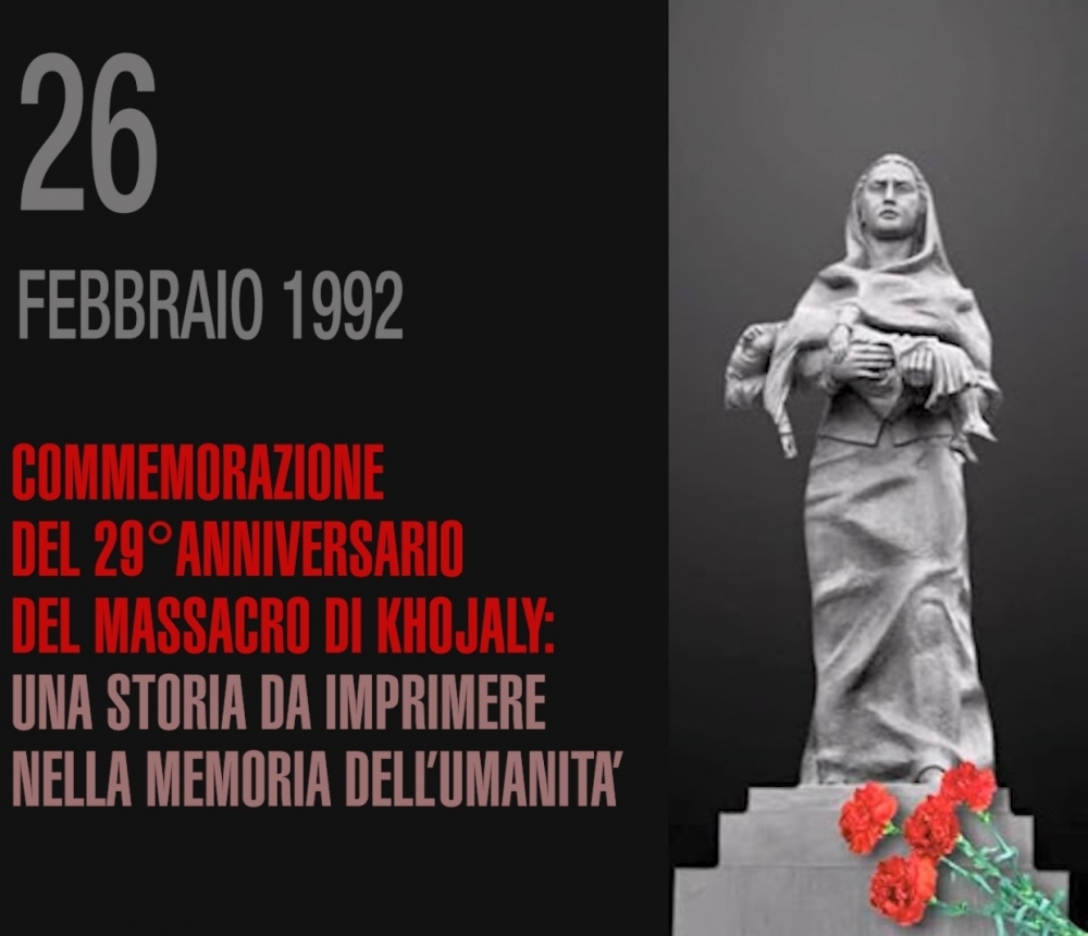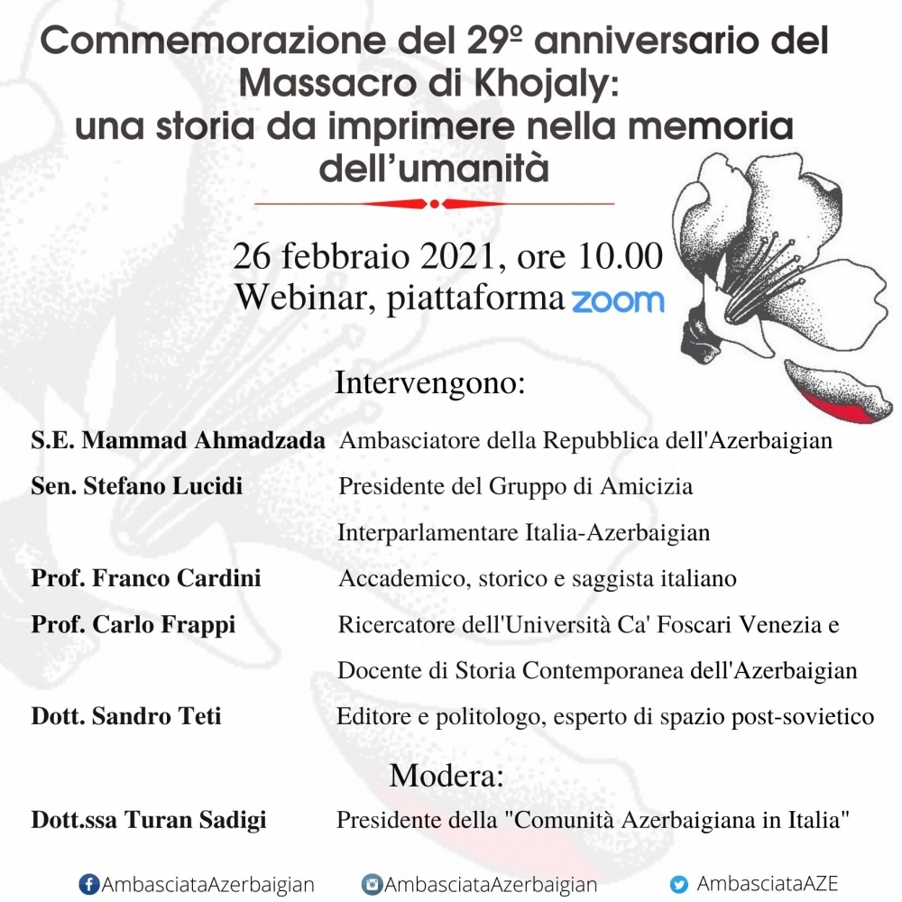 Azərbaycanın İtaliyadakı Səfirliyi və İtaliyada Azərbaycan İcması Assosiasiyasının birgə təşkilatçılığı ilə Xocalı soyqrımının 29-cu ildönümünün anılması ilə əlaqədar videoformatda "Bəşəriyyətin yaddaşına yazılan bir tarix" adlı konfrans və "Simurq quşu - Xocalının qanadları altında" adlı konsert-rekviyemdən ibarət tədbir keçirilib. Tədbir Azərbaycan Respublikasının İtaliyadakı Səfirliyinin rəsmi Facebook sosial şəbəkə profili üzərindən 26 fevral tarixində səhər saatlarında canlı yayımlanıb.