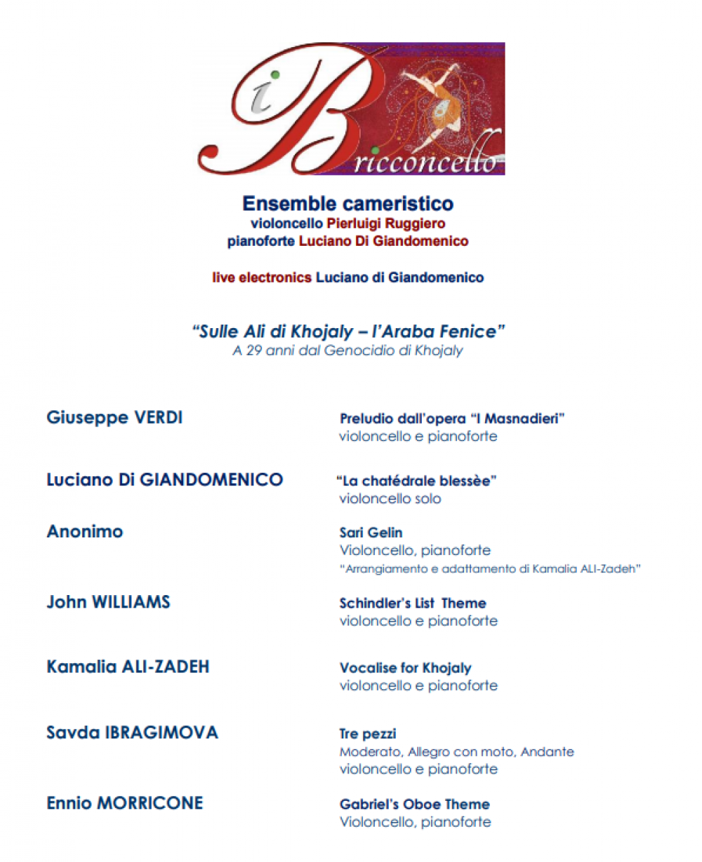 Tədbir İtaliyanın "I Bricconcello" kamera ansamblının üzvləri, tanınmış musiqiçilər violançelist Pierluici Ruccero və pianoçu Luçiano Di Candomeniconun ifasında Xocalı qurbanlarının xatirəsinə həsr olunan Azərbaycan, italyan və dünya musiqi irsindən olan təsirli parçalardan, o cümlədən "Sarı gəlin", Kəmalə Əli-zadənin "Xocalı üçün vokalis" və Sevda İbrahimovanın əsərlərindən ibarət konsert-rekviyem ilə davam edib.