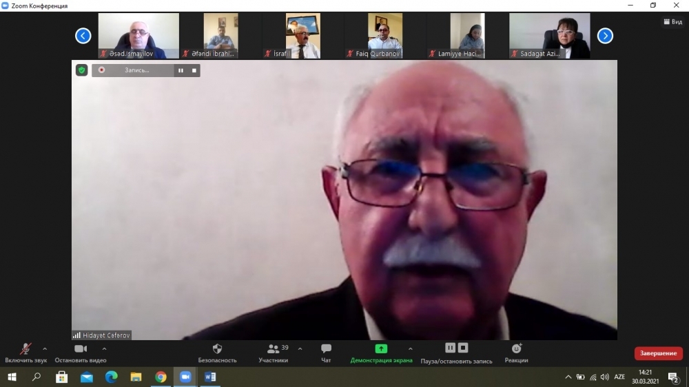 Prof. Hidayət Cəfərov 31 mart – azərbaycanlıların soyqırımı gününün xalqımızın çoxəsrlik tarixində faciəvi, eyni zamanda cəsarətli mübarizə nümunəsi kimi qiymətləndirərək bildirdi ki, 103 il əvvəl Bakıda və Azərbaycanın digər bölgələrində ermənilər tərəfindən törədilən bu dəhşətli qırğınlar tarixçilər tərəfindən Şərqdə Kərbala müsibəti ilə müqayisə olunur. Azərbaycan Xalq Cümhuriyyətinin 1918-ci il qırğınlarını araşdırmaq istiqamətində fəaliyyəti, yaradılan komissiya və toplanılan tarixi sənədlər, materiallar haqqında danışan H.Cəfərov qeyd etdi ki, Sovet İttifaqı sonralar bu faciəni sinfi mübarizə kimi qələmə verməyə çalışsa da, Ulu Öndər tarixi ədaləti bərpa etdi. 44 günlük Vətən müharibəsində isə ölkə başçısı, Ali Baş Komandanımız İlham Əliyev bütün erməni yalanları, miflərini bir daha ifşa edərək əzəli düşməniz üzərində möhtəşəm qələbə qazandı və xalqımızın başına gətirilən bütün faciələrin icraçıları olan ermənilər bu qətliamlara görə layiqli cəzalarını aldılar.