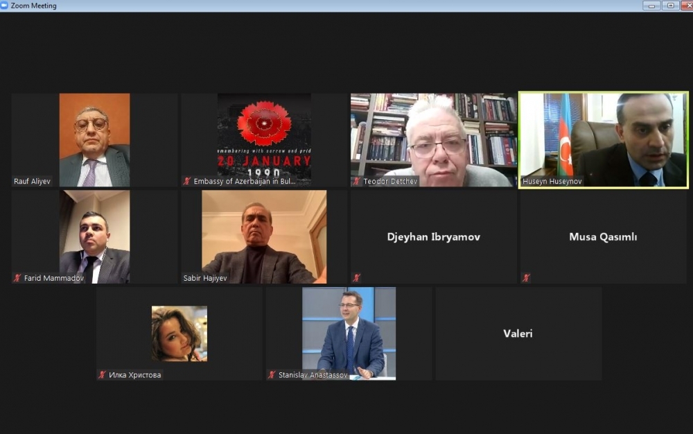 20 yanvar 2022-ci il tarixində Azərbaycan Respublikasının Bolqarıstan Respublikasındakı səfirliyinin təşkilatçılığı ilə 20 Yanvar faciəsinin 32-ci ildönümünə həsr olunmuş video konfrans keçirilmişdir. Konfransda Azərbaycan Respublikasının Bolqarıstandakı səfiriHüseyn Hüseynov, Milli Məclisin və Bolqarıstanın Xalq Məclisinin parlamentlərarası dostluq qruplarının üzvləri – Rauf Əliyev (sədr), Sabir Hacıyev, Musa Qasımlı, StanislavAnastasov, Ceyhanİbryamov, həmçinin Bolqarıstan Xalq Məclisinin Hüquq və Azadlıqlar Hərəkatı və Demokratik Bolqarıstan partiyalarının üzvləri, Bolqarıstanın elmi-tədqiqat dairələrinin üzvləri, yerli mütəxəssislər və media nümayəndələri iştirak və çıxış etmişlər.