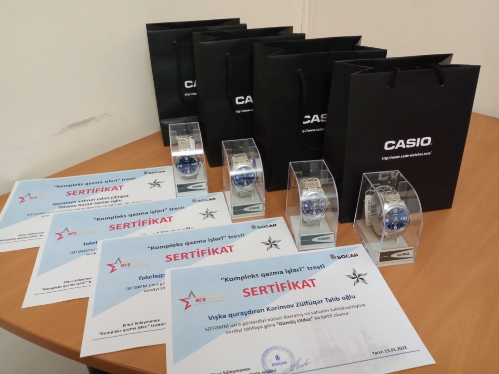 Artıq proqramın tətbiqi ilə bağlı ilkin qiymətləndirmə və mükafatlandırma da həyata keçirilib. Belə ki, trestin Qazmaservis istehsalat bölümünün və Təchizat və logistika bölümünün nümunəvi işçilərinin dəbilqələrinə “Gümüş Ulduz” etiket çapı vurulub, onlar müvafiq sertifikatla təltif olunub və qiymətli hədiyyələr ilə mükafatlandırılıblar.