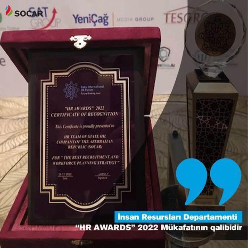 Azərbaycanda ilk dəfə keçirilən “HR AWARDS” - 2022 mükafatlandırma mərasimində “İşə qəbul və İşçi qüvvəsinin planlaşdırılması üzrə ən yaxşı strategiya (Best recruitment and workforce planning strategy)“ nominasiyası üzrə SOCAR bütün şirkətləri qabaqlayaraq qalib olub.