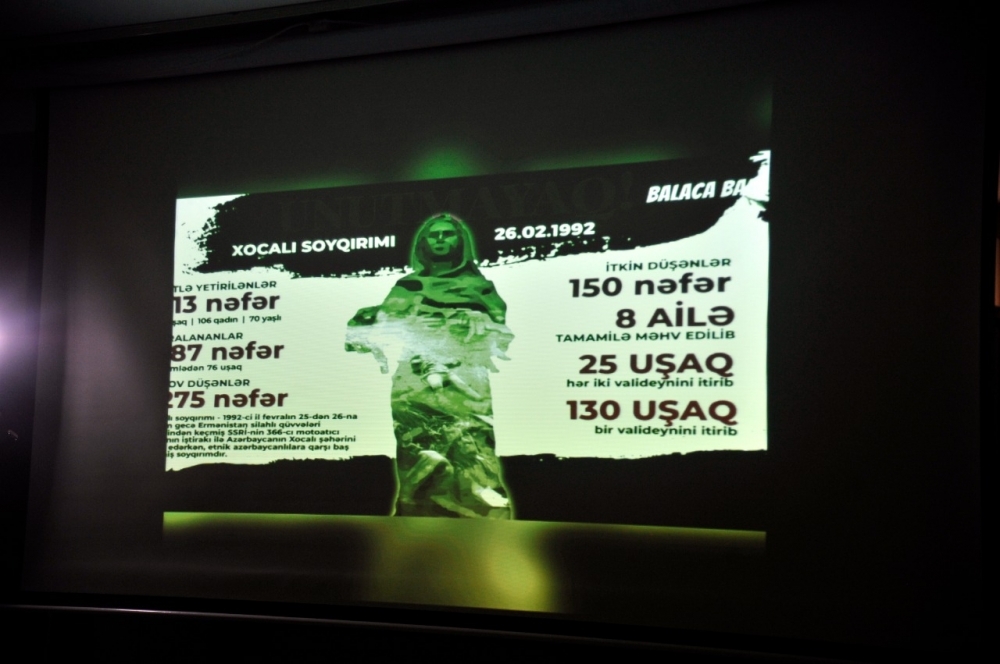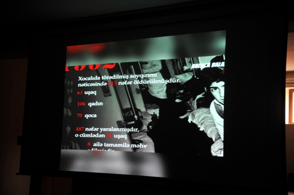 Tədbirdə çıxış edən Azərbaycan Dövlət Pedaqoji Universitetinin Tarix üzrə fəlsəfə doktoru dosent Elman Mirzəyev bildirib ki, 20-ci əsrin sonunda baş vermiş Xocalı soyqırım bütün bəşəriyyətə yönəlmiş bir soyqırım idi. E. Mirzəyev bildirib ki, Xocalı soyqırımı zamanı şəhər yerlə-yeksan edildi: “Həmin faciəvi gecə zamanı 487 nəfər Xocalı sakini ciddi şəkildə şikəst edildi və onlardan 76 nəfəri uşaqlardan ibarət idi. 8 ailə tamamilə məhv edildi, 25 uşaq hər iki valideynini və 130 uşaq isə bir valideynini itirdi. Qətlə yetirilən insanlardan 56 nəfəri xüsusi qəddarlıqla - diri-diri yandırılaraq, başının dərisi soyularaq, boynu vurularaq, gözləri çıxarılaraq, hamilə qadınların isə qarın boşluğuna süngü ilə vurularaq öldürülüb. Xocalı soyqırımının dünya miqyasında tanıdılması istiqamətində aparılan sistemli işin nəticəsidir ki, Xocalı soyqırımı bir çox ölkələrdə qəbul olunan parlament aktlarında tanınıb və xatırlanıb”.