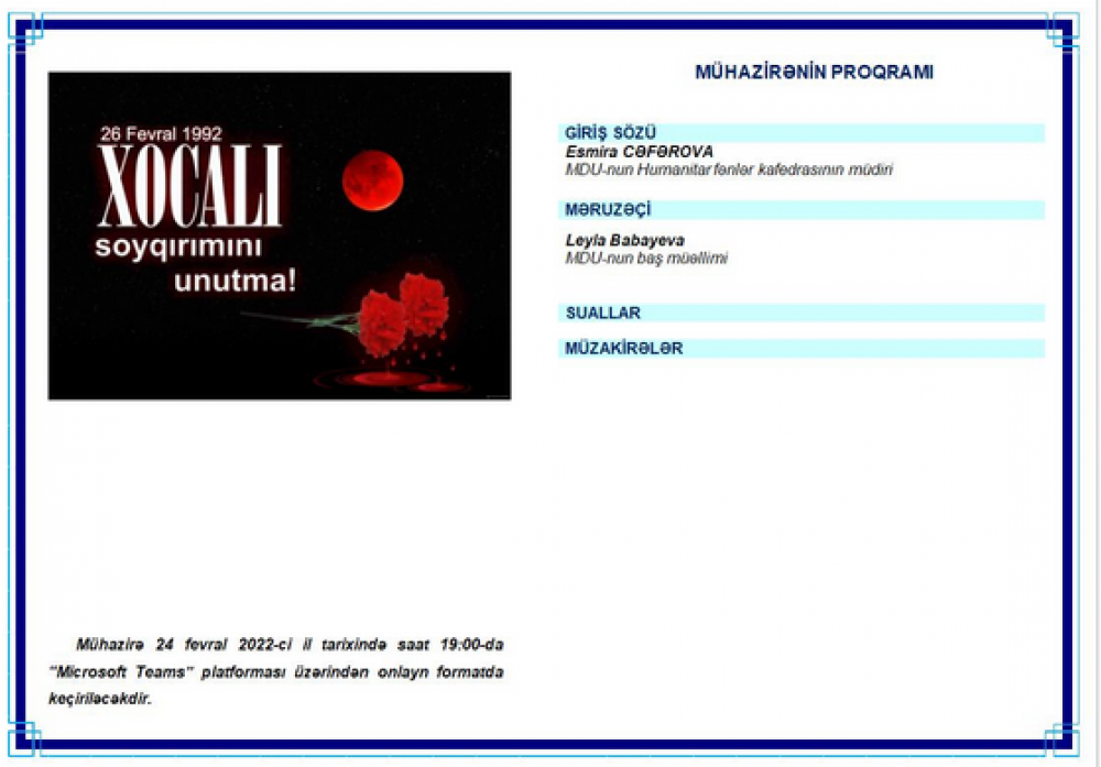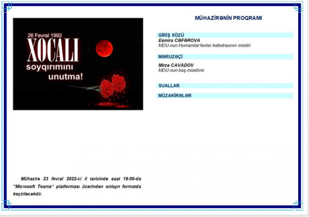 Qeyd edək ki, MDU-da Xocalı soyqırımının otuzuncu ildönümünə həsr olunan silsilə tədbirlər davam edir.