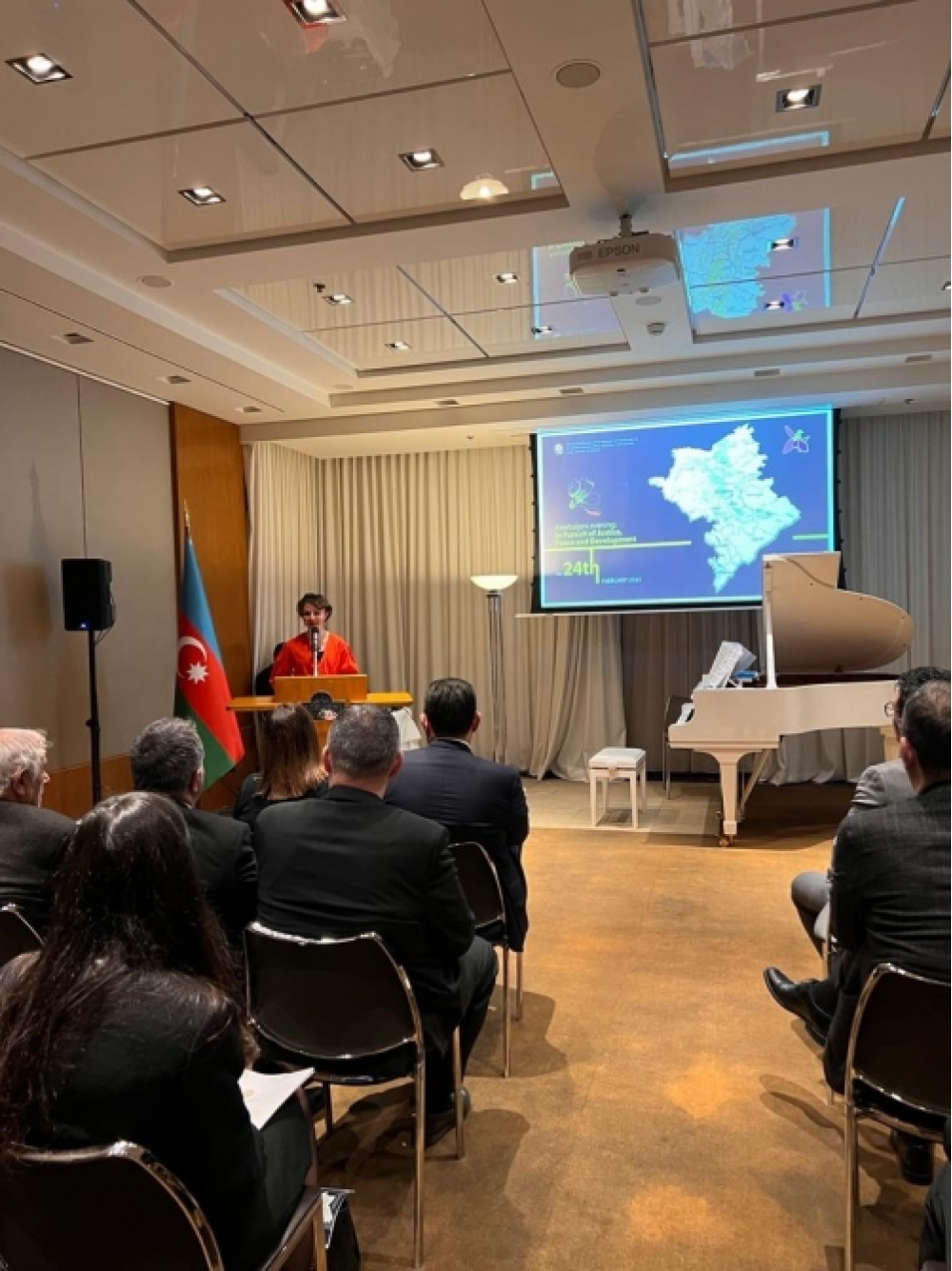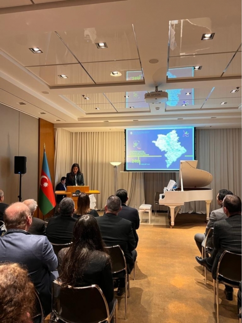 Daimi nümayəndəliyin əməkdaşı Nərmin Hüseynovanın təqdimatında ölkəmizin azad olunmuş ərazilərində aparılan təmir-bərpa işlərini əks etdirən videoçarxlar nümayiş olunub.