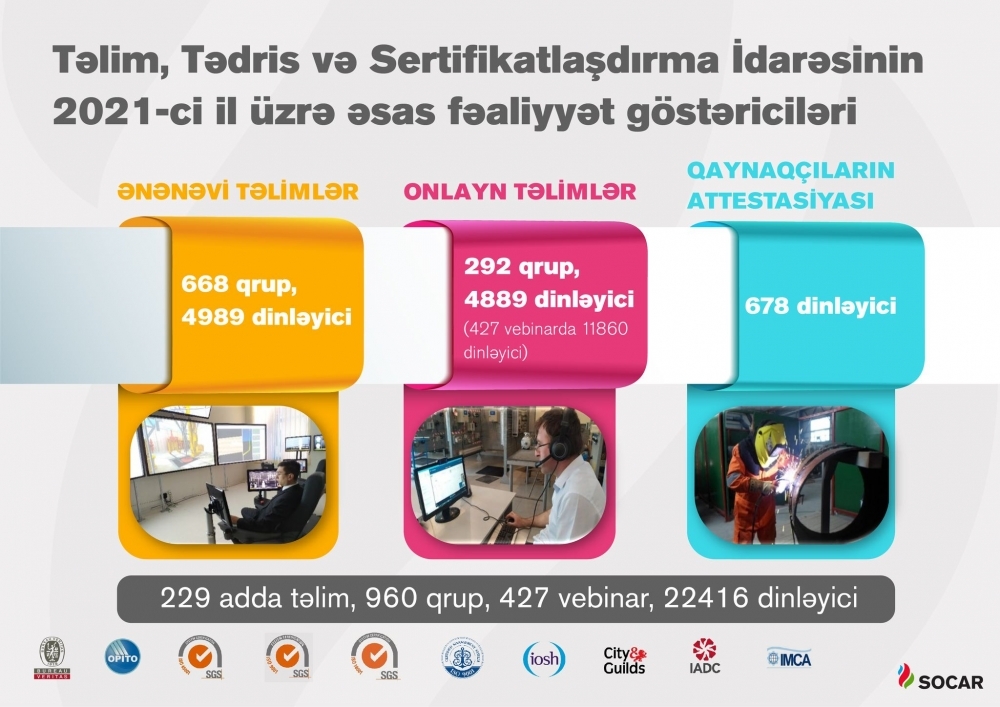 "SOCAR-ın 2011-ci ildən fəaliyyət göstərən Təlim, Tədris və Sertifikatlaşdırma İdarəsində (TTSİ) təşkil edilən kurslar beynəlxalq standartların tələblərinə uyğun həyata keçirilir."