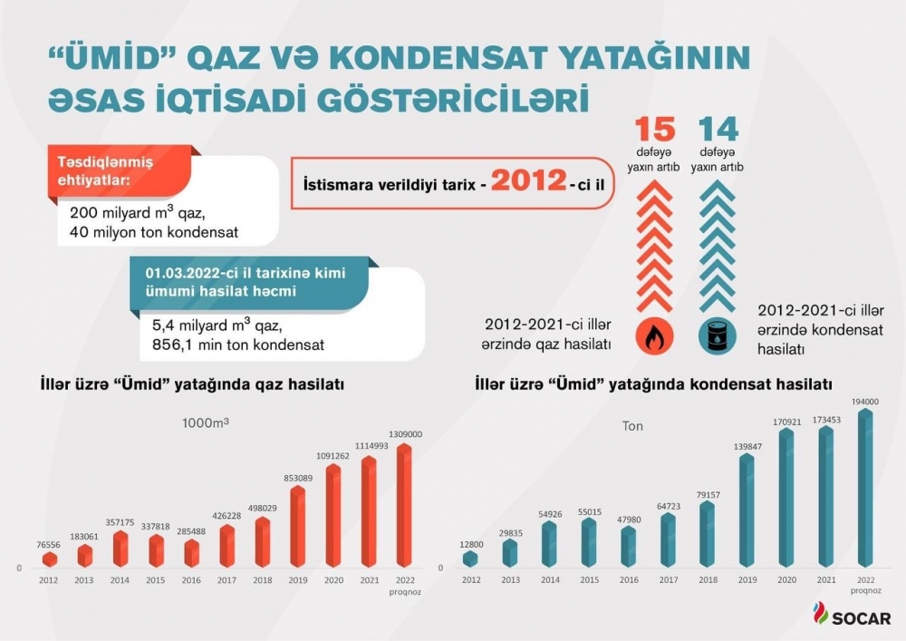 “İki sahil” xəbər verir ki, paylaşımda qeyd olunur ki, Azərbaycanın müstəqilliyi dövründə SOCAR-ın geoloqları tərəfindən kəşf edilmiş ilk yataq olan “Ümid” qaz və kondensat yatağından 1 mart 2022-ci il tarixinə kimi 5,4 milyard m3 təbii qaz və 856,1 min ton kondensat hasil edilib.