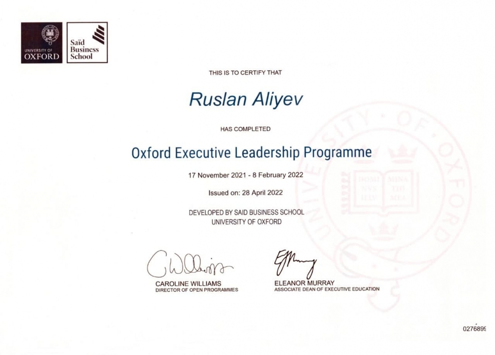 SOCAR-ın «Azəriqaz» İstehsalat Birliyinin baş direktoru Ruslan Əliyev növbəti uğurunu qazanıb. Belə ki, o, Oksford Universitetinin "Oxford Executive Leadership Programme” üzrə sertifikatını alıb. Bu, liderliyin inkişafı proqramı fərqli sektordan olan liderlərə bir çox mürəkkəb suallara cavab verməyə və onlara təşkilatları daxilində koorporativ dəyərlərin formalaşdırılmasına imkan yaradır.