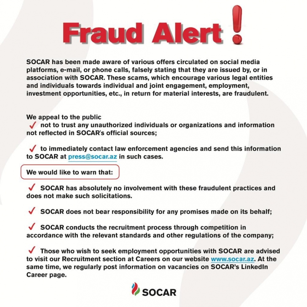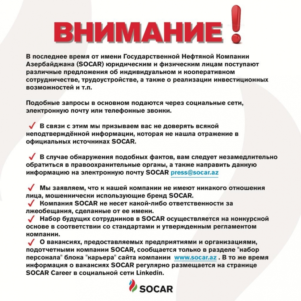 SOCAR-ın rəsmi mənbələrində əks olumayan hec bir məlumata etibar etməyin