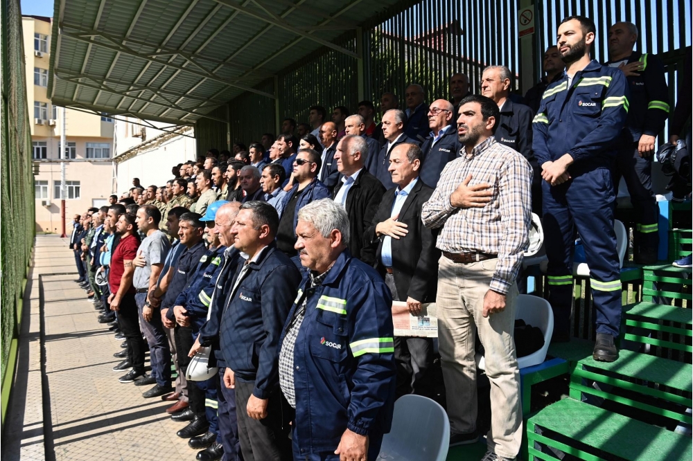 “Neftçi” PFK ilə neftçilər arasında keçirilən mini-futbol üzrə yoldaşlıq görüşünün əvvəlində Azərbaycan Respublikasının Dövlət himni səsləndirilib və Vətən uğrunda şücaət göstərərək canlarını qəhrəmancasına fəda etmiş şəhidlərimizin əziz xatirəsi bir dəqiqəlik sükutla yad edilib. Futbolçular topları, neftçilər dəbilqələri qarşılıqlı olaraq bir-birlərinə hədiyyə ediblər.