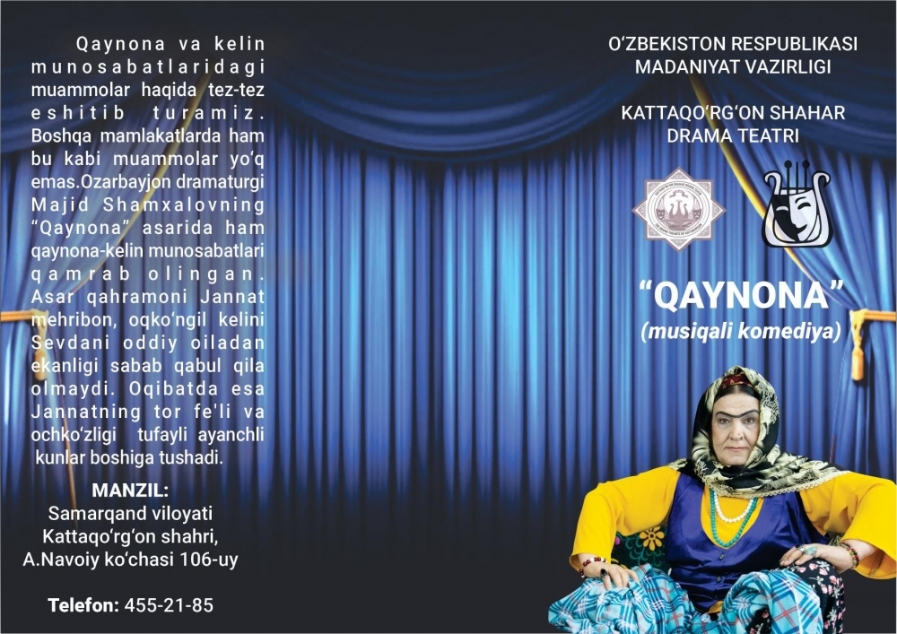 “İki sahil” xəbər verir ki, özbək teatrı səfər çərçivəsində Azərbaycanın klassik səhnə əsəri olan “Qaynana” (M.Şamxalov) komediyasını nümayiş etdirəcək.