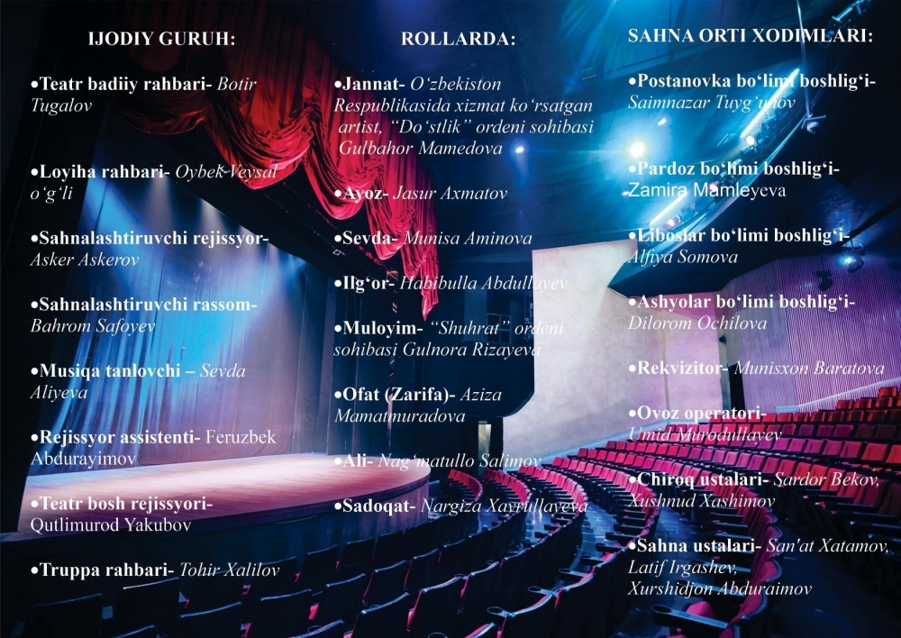 Xatırladaq ki, bu ilin yayında Akademik Musiqili Teatrın quruluşçu rejissoru, Əməkdar incəsənət xadimi Əsgər Əsgərov Avrasiya Teatr Birliyinın dəvəti ilə Özbəkistana, məhz bu tamaşaya quruluş vermək üçün Kattakurqan teatrına dəvət olunmuşdu.