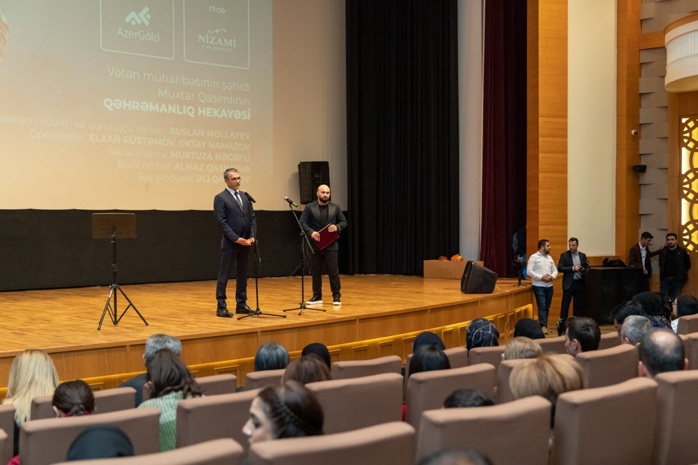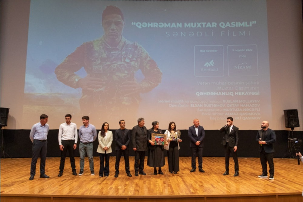 Noyabrın 3-də Nizami Kino Mərkəzində “AzerGold” Qapalı Səhmdar Cəmiyyətinin (QSC) baş sponsorluğu ilə ərsəyə gəlmiş, Vətən müharibəsi şəhidi Muxtar Qasımlıya həsr olunan “Qəhrəman Muxtar Qasımlı” sənədli filminin təqdimat mərasimi keçirilib.