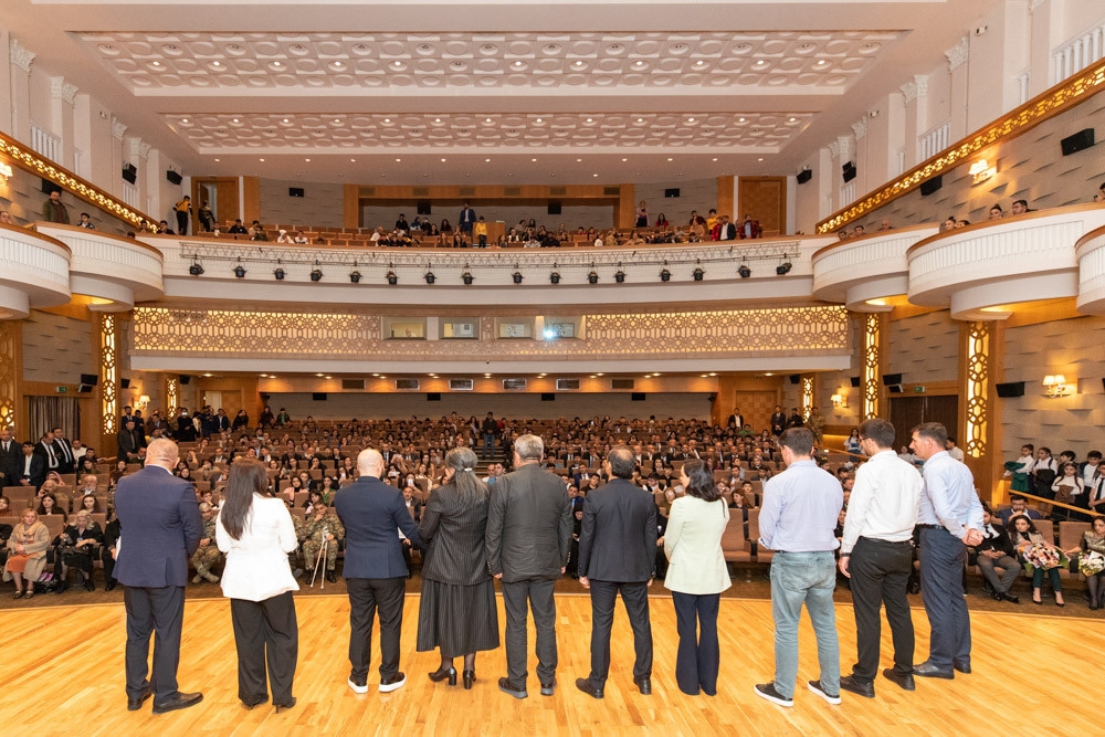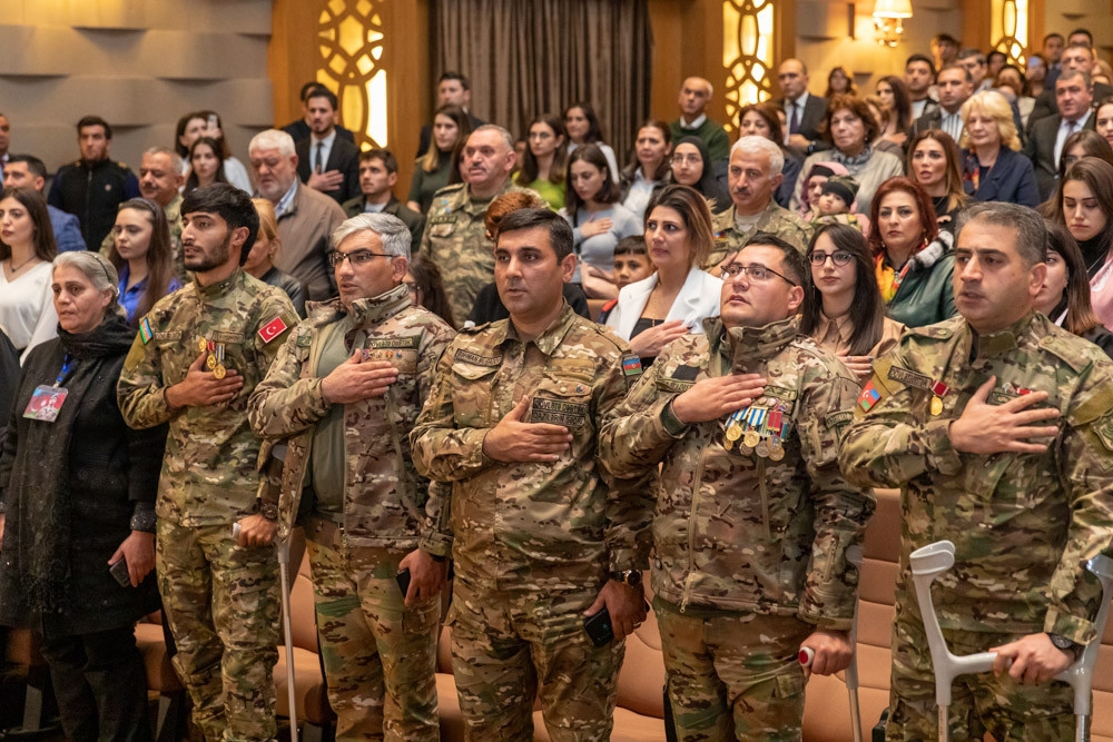 “İki sahil” xəbər verir ki, dövlət və hökumət rəsmiləri, mədəniyyət və incəsənət xadimləri, müharibə iştirakçıları, şəhid anaları və digər ictimaiyyət nümayəndələrinin iştirak etdiyi tədbir Azərbaycan Respublikasının dövlət himninin səsləndirilməsi ilə başlayıb. Daha sonra ölkəmizin müstəqilliyi, ərazi bütövlüyü uğrunda canlarından keçən şəhidlərimizin əziz xatirəsi bir dəqiqəlik sükutla yad edilib.