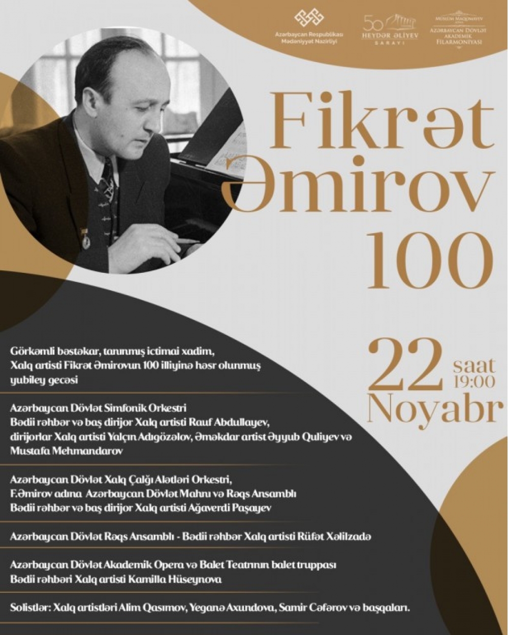 Qeyd olunub ki, cari ilin noyabrın 12-23-də Bakı və Gəncə şəhərində silsilə konsertlər, tamaşalar və müvafiq tədbirlərin icrası planlaşdırılır. Belə ki, 12 noyabr tarixində Azərbaycan Dövlət Akademik Opera və Balet Teatrında bəstəkarın “Nizami” baleti, 13 noyabr tarixində teatrın kollektivi Fikrət Əmirov adına Gəncə Dövlət Filarmoniyasında bəstəkarın “Sevil” operasını təqdim edəcək. 18 noyabr tarixində eyni məkanda Azərbaycan Dövlət Simfonik Orkestri konsert proqramı ilə çıxış edəcək.