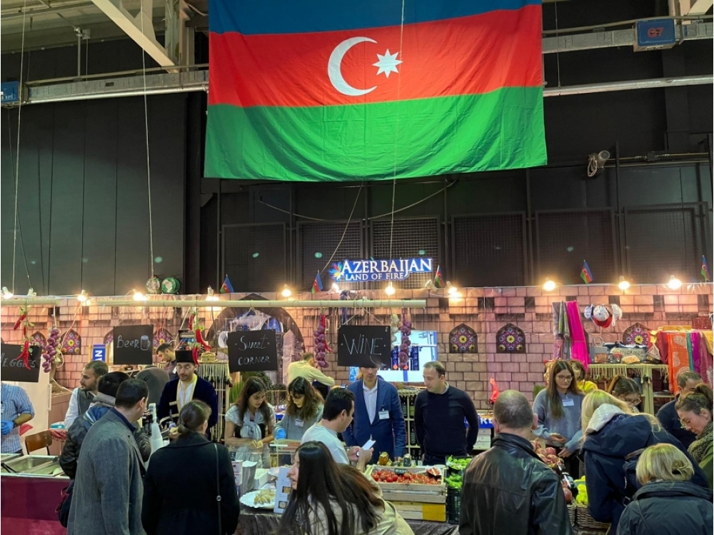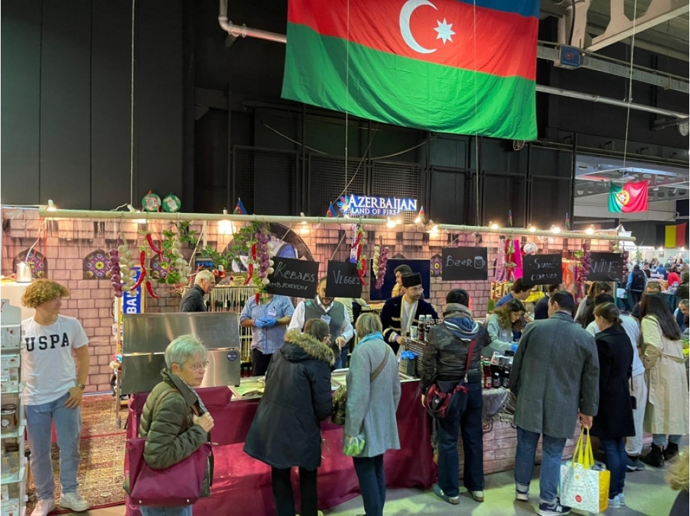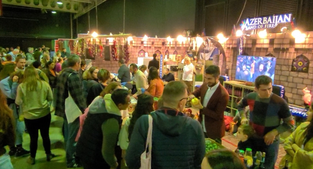 Azərbaycan stendinin ziyarətçiləri Azərbaycan milli mətbəxinin ləziz təamlarını dadırlar.