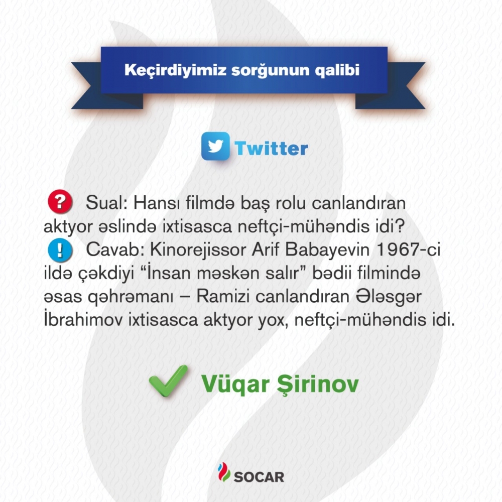 Qeyd edək ki, SOCAR-ın əvvəlki sorğularında iştirak edən və qalib olan namizədlər yeni sorğularda iştirak edə bilməz. SOCAR və onun müəssisələrinin əməkdaşları sorğuda iştirak edə bilməz. Yalnız real profillərdən verilən cavablar qəbul edilib.