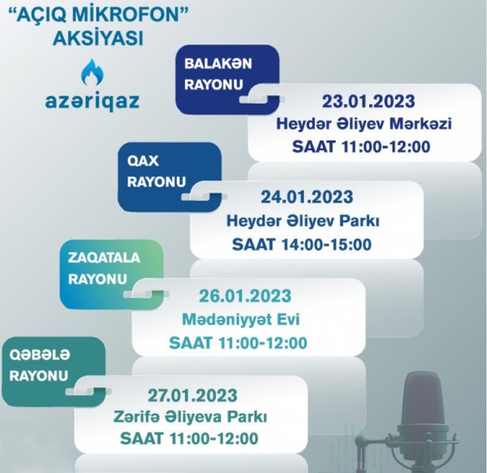 Növbəti həftə (yanvarın 23-24 və 26-sı tarixləri) daha 4 rayonda vətəndaşlarla “Azəriqaz” İB-nin “Açıq mikrofon” aksiyası keçiriləcək.