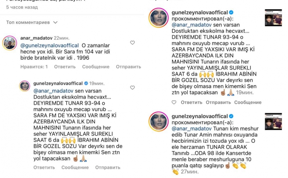 “İki sahil” xəbər verir ki, sosial şəbəkədə yayımlanan yazıya bir çox etiraz dolu şərhlər yazılıb. Prodüser Anar Mədətov da Axşam.az-ın instaqram səhifəsində Güneli işarələyərək "Tunarı kim məşhur edib" sualını ünvanlayıb.