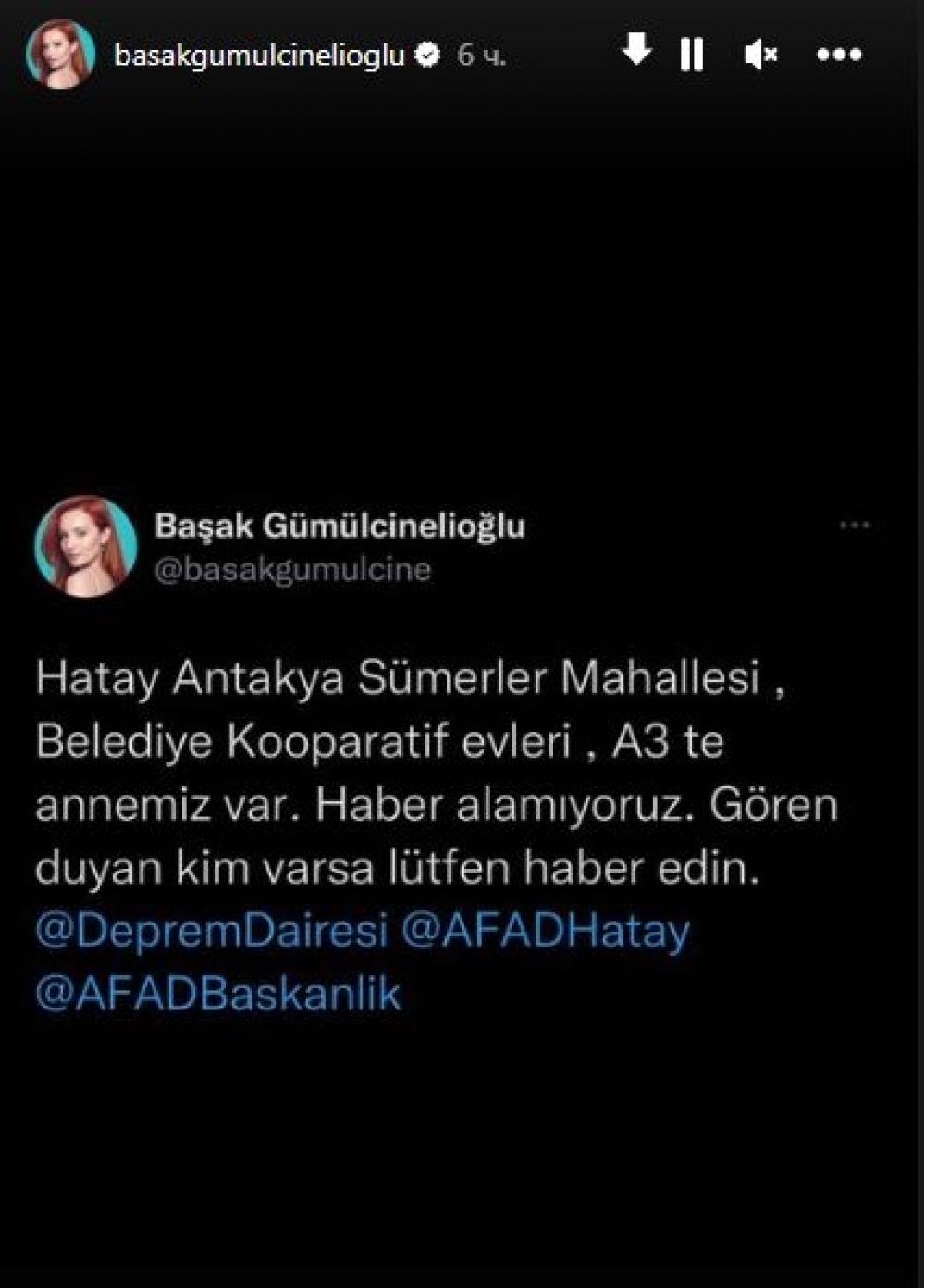 “İki sahil” xəbər verir ki, bu barədə aktrisa sosial media hesabında yazıb. O, Hatay vilayətinin Antakya bölgəsində qalan anasından xəbər ala bilmədiyini vurğulayıb: "Hatayın Antakya bölgəsində, Sümerler məhəlləmizdə anamız var, xəbər ala bilmirik. Görən və ya eşidən varsa, xahiş edirəm mənə xəbər versin”.