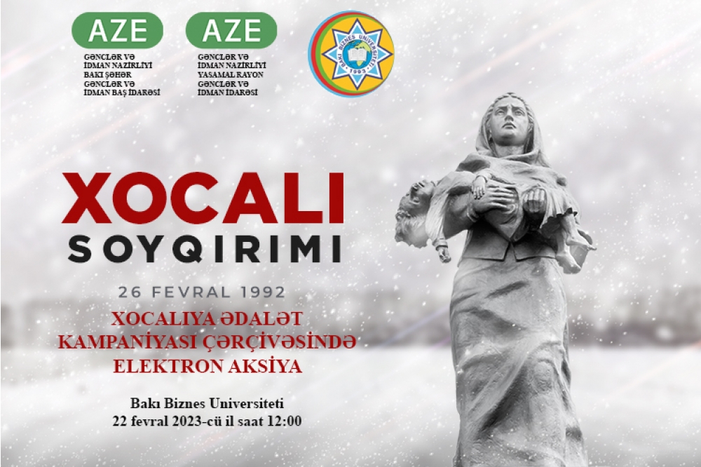 Bakı Biznes Universitetində Heydər Əliyev Fondunun vitse-prezidenti Leyla xanım Əliyevanın təşəbbüsü ilə aparılan “Xocalıya ədalət” beynəlxalq kampaniyası çərçivəsində Xocalı soyqırımına həsr olunmuş elektron aksiya keçirilib. Bakı şəhər Gənclər və İdman Baş idarəsi,Yasamal rayon Gənclər və İdman idarəsi və Bakı Biznes Universitetinin birgə təşkilatçılığı ilə həyata keçirilən tədbir Azərbaycan Respublikası dövlət himninin səsləndirilməsi ilə başlayıb. Daha sonra Xocalı soyqırımı qurbanlarının xatirəsi bir dəqiqəlik sükutla yad edilmişdir. Aksiyanın məqsədi Xocalı soyqırımı ilə bağlı həqiqətləri dünya ictimaiyyətinə çatdırmaq və kampaniyaya dəstək verməkdir.