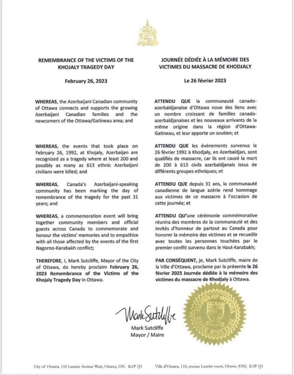 Kanadanın paytaxtı Ottava şəhərində 26 fevral 2023-cü il tarixi Xocalı faciəsi qurbanlarının Anım Günü elan olunub.