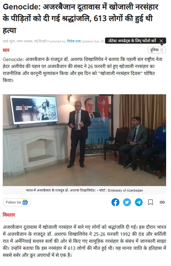 Hindistanın “amarujala.com” saytında yer alan məqalədə bildirilib ki, Xocalı soyqırımı bəşər tarixində ən qanlı və amansız cinayətlərdən biridir. Yeddi min nəfərə yaxın əhalisi olan şəhər bir gecədə yerlə-yeksan edilib. Ermənilər beynəlxalq humanitar hüquqa və müvafiq konvensiyalara məhəl qoymayaraq, 613 mülki şəxsi, o cümlədən 106 qadın, 63 uşaq, 70 qocanı xüsusi amansızlıqla qətlə yetiriblər. Bu qırğında 8 ailə tamamilə məhv edilib, 25 uşaq hər iki valideynini, 132 uşaq valideynlərindən birini itirib. Qətliam nəticəsində 487 nəfər ağır yaralanıb, 1275 nəfər girov götürülüb ki, onlardan 150 nəfərin taleyi hələ də məlum deyil.