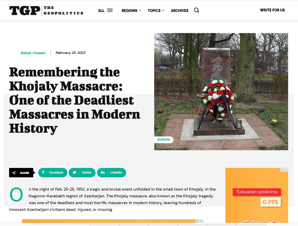 Nüfuzlu “The Geopolitics” nəşrinin saytında yayımlanan “Xocalı soyqırımını anarkən: Müasir tarixin ən qanlı soyqırımlarından biri” sərlövhəli məqalədə ağır artilleriya, pulemyot və qumbaraatanlarla silahlanmış Ermənistan qoşunlarının 1992-ci il fevralın 25-dən 26-na keçən gecə Xocalı şəhərinə qanlı hücumu nəticəsində azərbaycanlı mülki şəxslərin, o cümlədən 106 qadın, 63 uşaq və 70 qocanın qətlə yetirildiyi bildirilib. Qeyd olunub ki, bu qanlı hücum nəticəsində 487 nəfər ağır yaralanıb, 150 nəfərin taleyi barədə indiyədək heç bir məlumat yoxdur. Xüsusi vurğulanıb ki, əhalinin tamamilə məhv edilməsi üçün hücum zamanı şəhərin mühüm infrastruktur obyektləri də hədəfə alınıb.