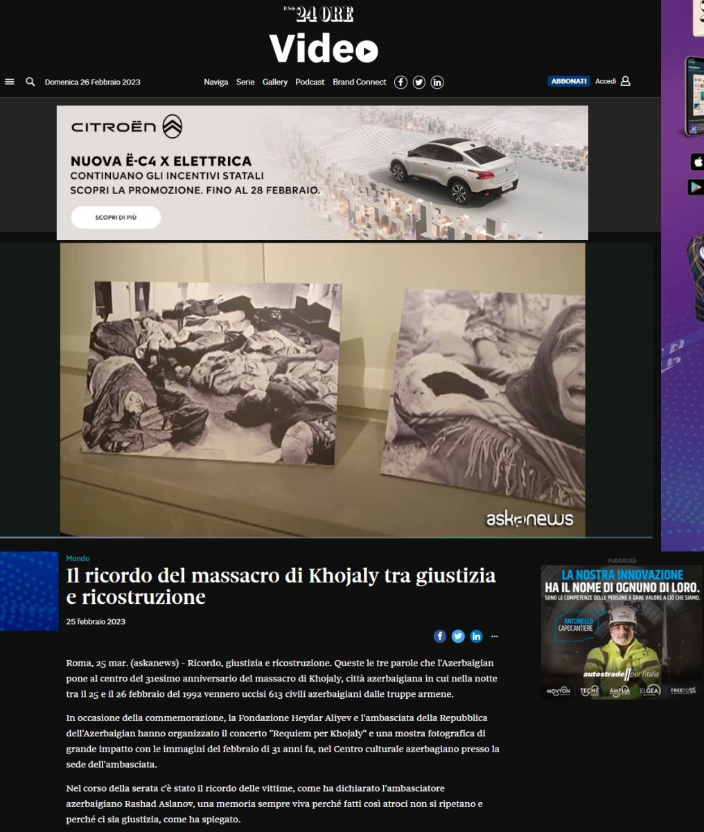 İtaliyanın nüfuzlu “İl Sole24Ore” televiziya kanalı da Xocalı faciəsinin 31-cü ildönümünə geniş yer ayırıb. Məqalədə Xocalı soyqırımı barədə məlumat verilib, 613 günahsız insanın erməni hərbi birləşmələri tərəfindən xüsusi amansızlıqla qətlə yetirildiyi bildirilib. Məlumatda Xocalı soyqırımının 31-ci ildönümü ilə əlaqədar Heydər Əliyev Fondunun və Azərbaycanın İtaliyadakı səfirliyinin birgə təşkilatçılığı ilə anım mərasiminin keçirildiyi qeyd olunub, həmin tədbirdən görüntülər təqdim edilib.