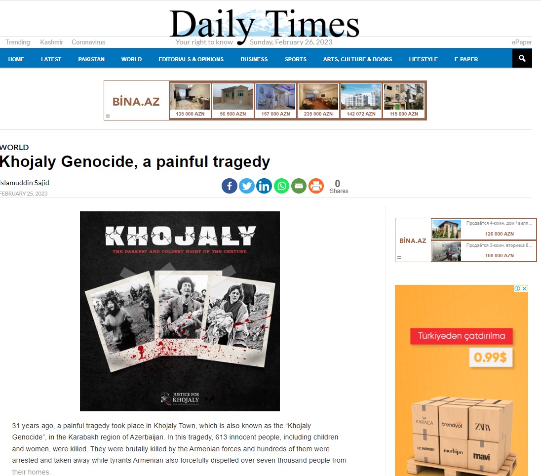 Pakistanda yayımlanan “Daily Times” qəzetində dərc olunan məqalədə Ermənistan-Azərbaycan münaqişəsinin tarixindən söz açılıb, Ermənistan ordusunun Xocalı şəhərində günahsız insanları xüsusi amansızlıqla qətlə yetirməsi barədə məlumat verilib: “31 il əvvəl Azərbaycanın Qarabağ bölgəsindəki Xocalı şəhərində ağır qətliam törədilib. Bu faciə zamanı 613 günahsız insan, o cümlədən uşaqlar və qadınlar erməni silahlı birləşmələri tərəfindən vəhşicəsinə qətlə yetirilib, yüzlərlə insan girov götürülüb. Erməni cəlladları yeddi mindən çox insanı bir gecədə doğma evlərindən zorla qovub çıxarıblar”.