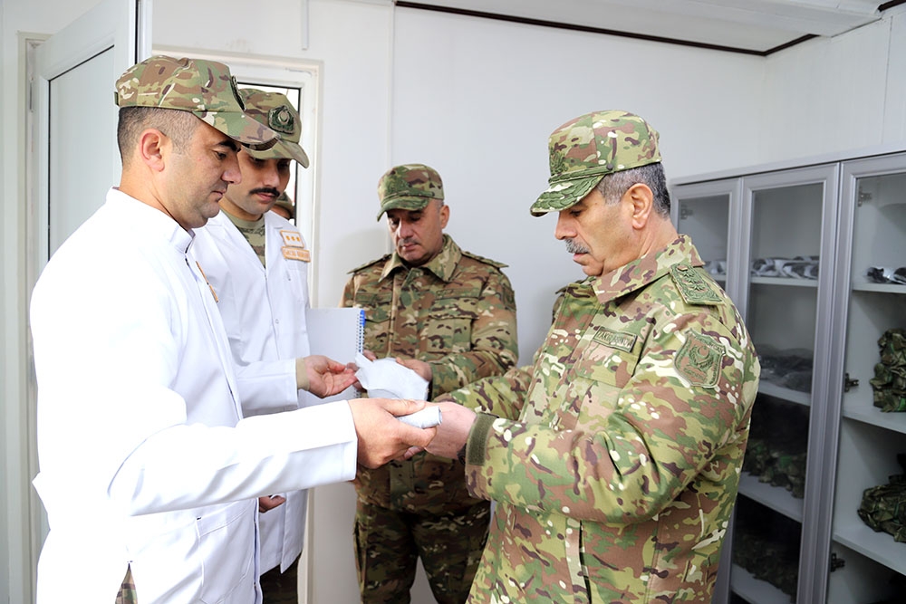 Məşğələləri izlədikdən sonra mərkəzdə yeni istifadəyə verilən tibb məntəqəsinə gələn müdafiə nazirinə məruzə edilib ki, müasir tələblərə cavab verən məntəqədə hərbi qulluqçuların sağlamlıqlarının təmin olunması, onlara ilkin yardımın göstərilərək ehtiyac olduğu təqdirdə hospitala təxliyə edilməsi üçün lazımi şərait yaradılıb. Tibb məntəqəsində qəbul-diaqnostika otağı, palatalar, eləcə də inzibati otaqlar mövcuddur.
