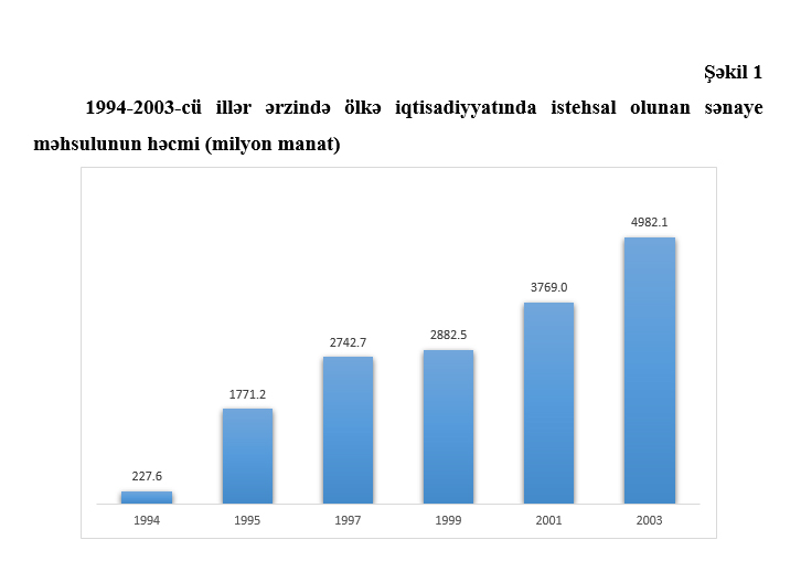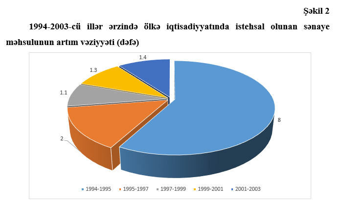 Təhlillər nəticəsində aydın olur ki, təkcə 1994-1995-ci illər ərzində istehsal olunan sənaye məhsulunun həcmi 8 dəfə artmışdır. Bu göstərici bir çox tərəflərinə görə əlamətdar nəticədir. Hər şeydən əvvəl bu, Ümummilli Liderin uzaqgörən siyasi və dövlətçilik təcrübəsi əsasında təşəkkül tapan müasir iqtisadi siyasətin güclü dayaqlarının ifadəsini təqdim edirdi. Eyni zamanda, məhz bu əsasda, yaradılmış olan siyasi sabitlik özü ilə birlikdə davamlı iqtisadi inkişaf üçün etibarlı istinad nöqtəsinə çevrildi və artıq 1995-ci ildən etibarən başlanmış olan iqtisadi islahatlar, o cümlədən, dövlət mülkiyyətinin özəlləşdirilməsi prosesləri müstəvisində daha perspektivli bir mərhələnin əsasları qoyuldu. Sonrakı illər ərzində də bu artım dinamikası qorunmuş və müasir milli iqtisadi prioritetlərin təməl prinsipləri olaraq çıxış etmişdir. Diqqət etdikdə aydın olur ki, bütövlükdə 1994-2003-cü illər ərzində yaradılmış olan sənaye məhsulunun həcmində 22 dəfəlik artım qeydə alınmışdır. Bu dinamika istinad olunan hər bir il üzrə də özünü göstərmişdir.