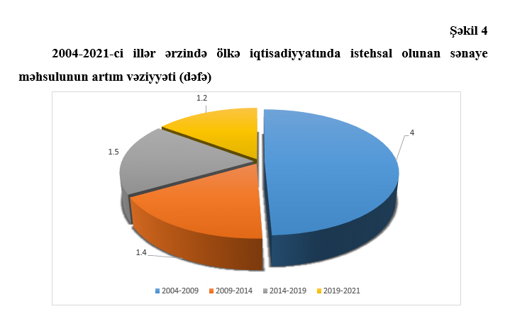 Təhlillər nəticəsində aydın olur ki, 2004-2021-ci illər ərzində istehsal olunan sənaye məhsullarının həcmi 9,3 dəfə artmışdır. Şəklin məlumatlarına diqqət edərkən regional inkişaf üzrə Dövlət proqramlarının icrasına başlanıldığı hər il üzrə dinamik artım diqqəti çəkməkdədir. Həmin təhlilləri davam etdirdikdə, aydın olur ki, sənaye məhsulunun həcmi 2004-2009-cu illərdə 4, 2009-2014-cü illərdə 1,4 dəfədən artıq, 2014-2019-cu illərdə 1,5, 2019-2021-ci illərdə isə 1,2 dəfə artmışdır. Bunu şəkil 4-ün məlumatlarında da görmək olar.