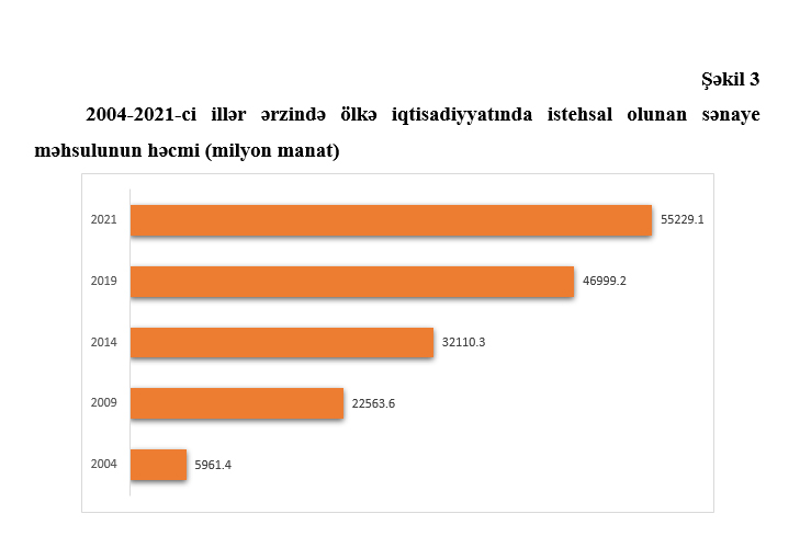Bu qeyd olunan amillər Ulu Öndərin həmişəyaşar siyasəti və ideyaları əsasında reallaşmaqdadır. Sənayenin bu əsaslar üzərində qərarlaşması 2003-cü ildən başlayaraq yeni keyfiyyət mərhələsi müstəvisində milli iqtisadiyyat üzrə perspektivlər müəyyən olundu və sənayenin inkişaf göstəriciləri artan dinamikada davam etdi. Bunlarla yanaşı, 2004-cü ildən başlayaraq, ölkəmizdə regional inkişaf üzrə Dövlət proqramlarının icra mexanizmlərinin müəyyən olunması sənayenin inkişafı istiqamətində mühüm bir mərhələ oldu. 2004-cü ildən etibarən icrasına başlanan Dövlət proqramlarının artıq dördüncü mərhələsi də tamamlanmaq üzrədir. Aşağıdakı şəklin məlumatlarında Dövlət Statistika Komitəsinin məlumatları əsasında 2004-2021-cü illəri əhatə etməklə istehsal olunan sənaye məhsulunun həcmi təqdim olunur.
