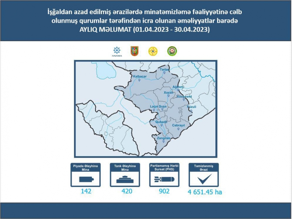 ANAMA-dan “İki sahil”ə verilən məlumata görə, aprelin 1-dən 30-dək Tərtər, Kəlbəcər, Ağdam, Xocalı, Xocavənd, Laçın, Füzuli, Şuşa, Qubadlı, Cəbrayıl və Zəngilanda aparılan minatəmizləmə əməliyyatları zamanı piyada əleyhinə 142, tank əleyhinə 420 mina və 902 partlamamış hərbi sursat aşkarlanaraq zərərsizləşdirilib.