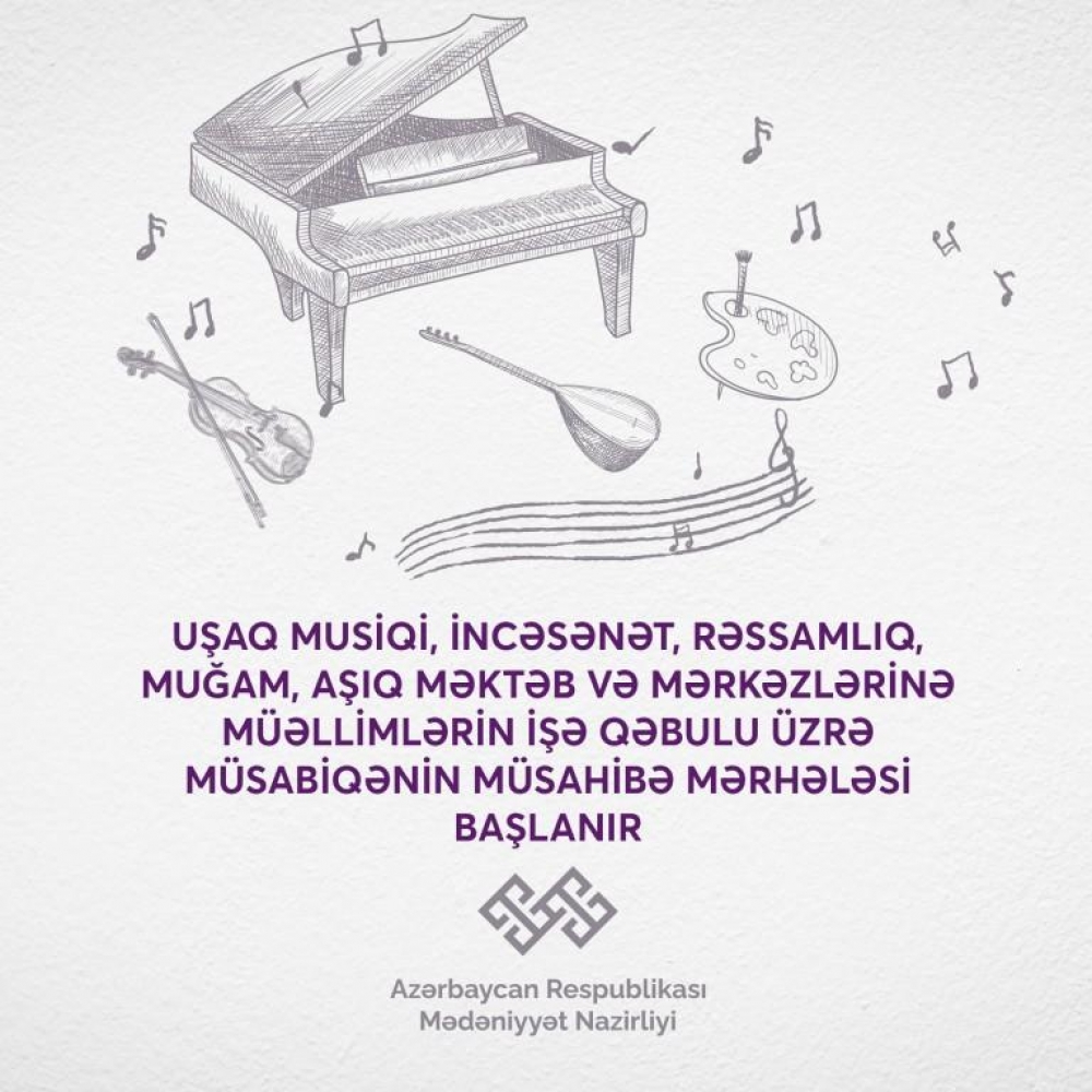 Bildirilib ki, Mədəniyyət Nazirliyinin tabeliyindəki uşaq musiqi, incəsənət, rəssamlıq, muğam, aşıq məktəb və mərkəzlərində təhsilin keyfiyyətinin yüksəldilməsi, bilikli və bacarıqlı ixtisaslı kadrların bərabərhüquqlu, şəffaf və sağlam rəqabət şəraitində seçilib yerləşdirilməsi məqsədilə məktəb və mərkəzlərə müəllimlərin işə qəbulu müsabiqə əsasında həyata keçirilir. Müsabiqə test imtahanından və müsahibədən ibarət olmaqla iki mərhələdə təşkil olunur.