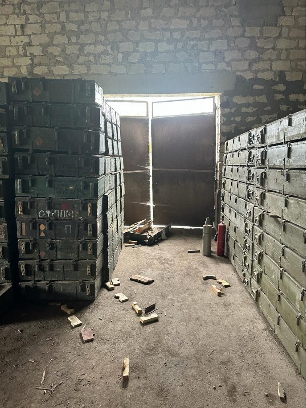 Anbar müxtəlif növ silah-susat, mərmi yeşikləri və digər hərbi təyinatlı məhsullarla doludur.