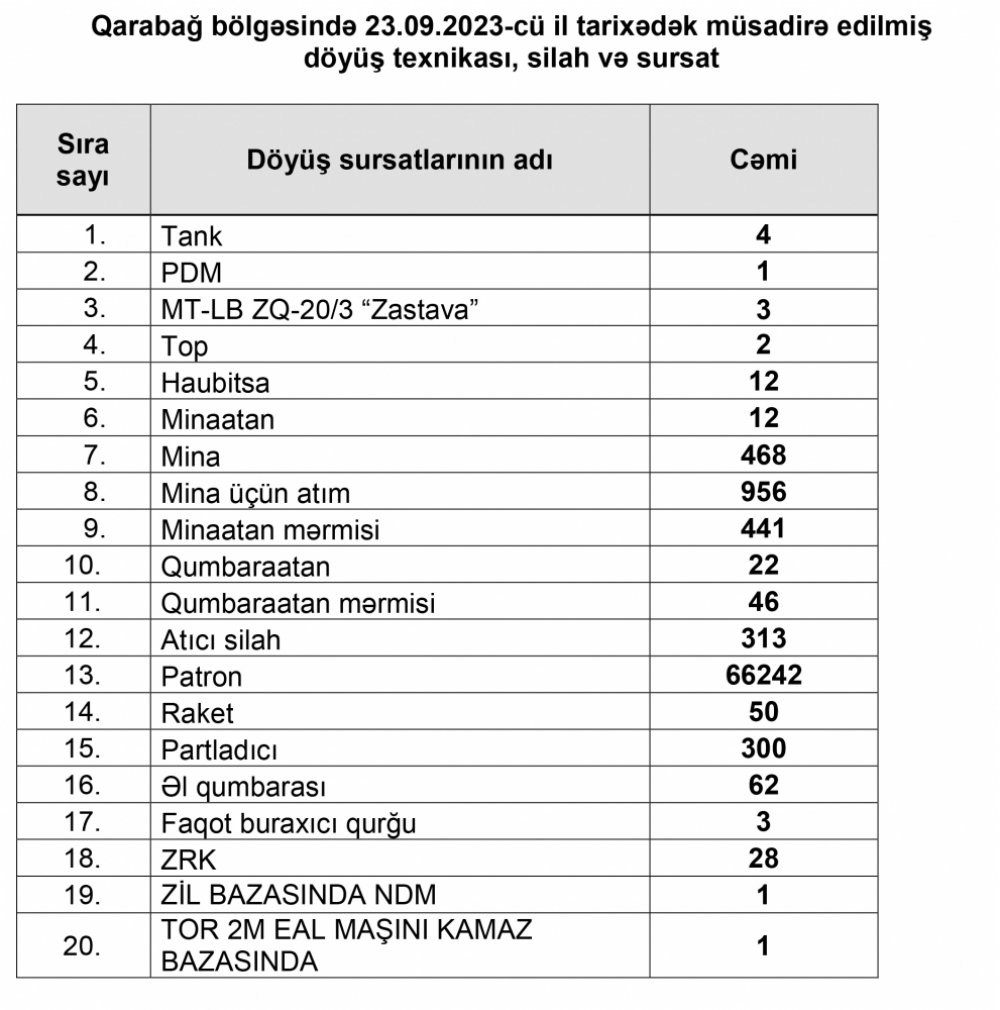 Azərbaycanın Qarabağ bölgəsində keçirilən lokal xarakterli antiterror tədbirləri başa çatdıqdan sonra sentyabrın 23-dək müsadirə edilmiş döyüş texnikası, silah və sursatın siyahısını təqdim edirik.