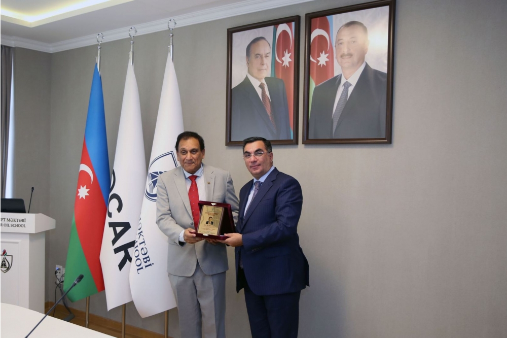 Sonda Bakı Ali Neft Məktəbinin rektoru Elmar Qasımov Surinam Respublikasının təhsil, elm və mədəniyyət naziri Henri Oriyə “Fəxri qonaq“ plaketini təqdim edib.